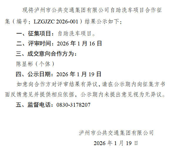 瀘州市公共交通集團(tuán)有限公司自助洗車項目合作征集結(jié)果公示