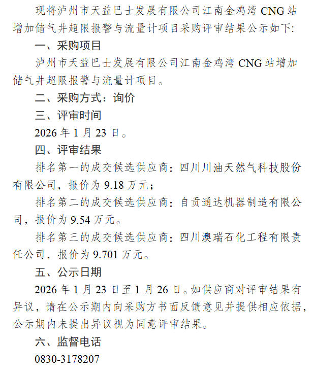 瀘州市天益巴士發(fā)展有限公司江南金雞灣CNG站增加儲氣井超限報警與流量計項(xiàng)目采購評審結(jié)果公示